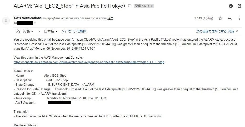 実際に通知が来るか試してみましょう。EC2サーバを停止してみます。
