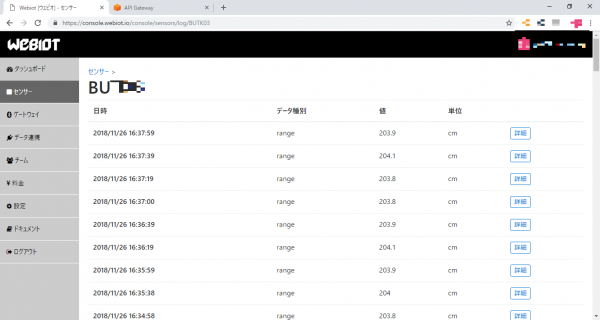 あとは、注文していたWebiotのデートウェイの電源を入れます。(電源を入れた後、初期化に30秒程度待つとゲートウェイのランプが緑に点滅して通信が開始されていました)データは、Webiotコンソール上でも確認できます。