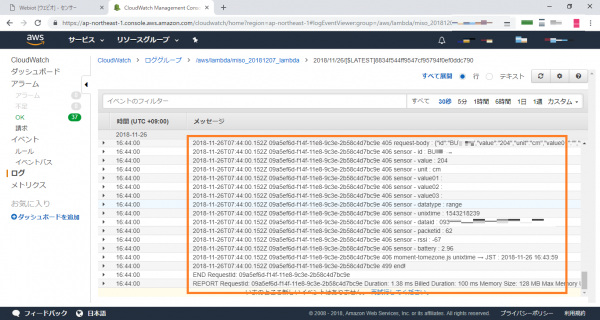 ログストリームを選択すると、API Gatewayに紐づけられたLambda関数(miso_20181207_lambda)内でconsole.log(“xxxxx”)とした部分が、Cloud Watchのログ上に出力され、AWS側でもデータが取得できていることが確認できました。