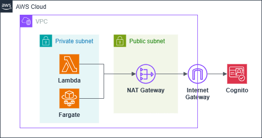 VPC内のプライベートサブネットに配置されたバックエンド(Lambda、ECS Fargateなど)が、CognitoのAPI(例:AdminInitiateAuthの実行、JWT検証のためのjwks_uriへのアクセス)を呼び出す必要があったとします。