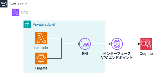 VPC内に作成されたENI(プライベートIPアドレスを持つネットワークインターフェース)を経由し、AWSのバックボーンネットワーク内でCognito APIへの通信が完結します。