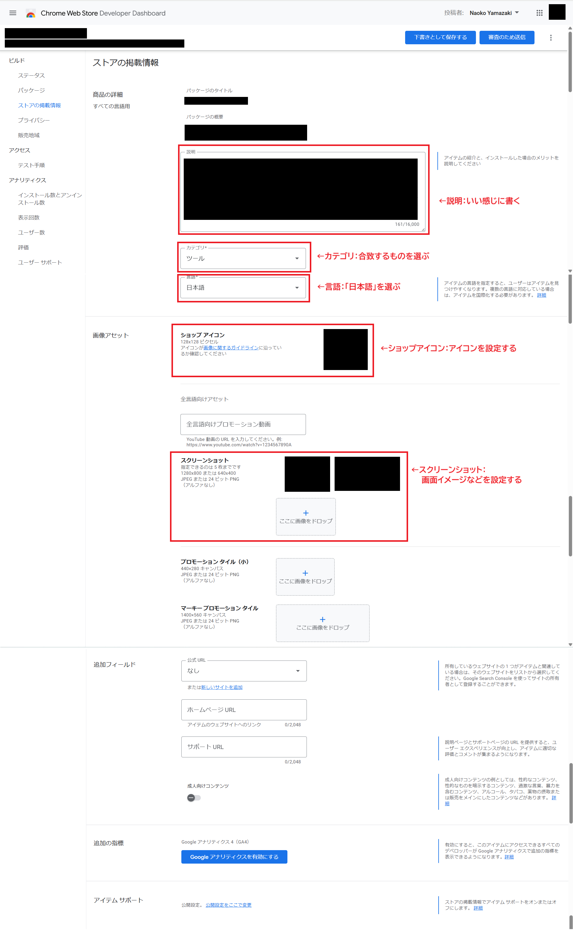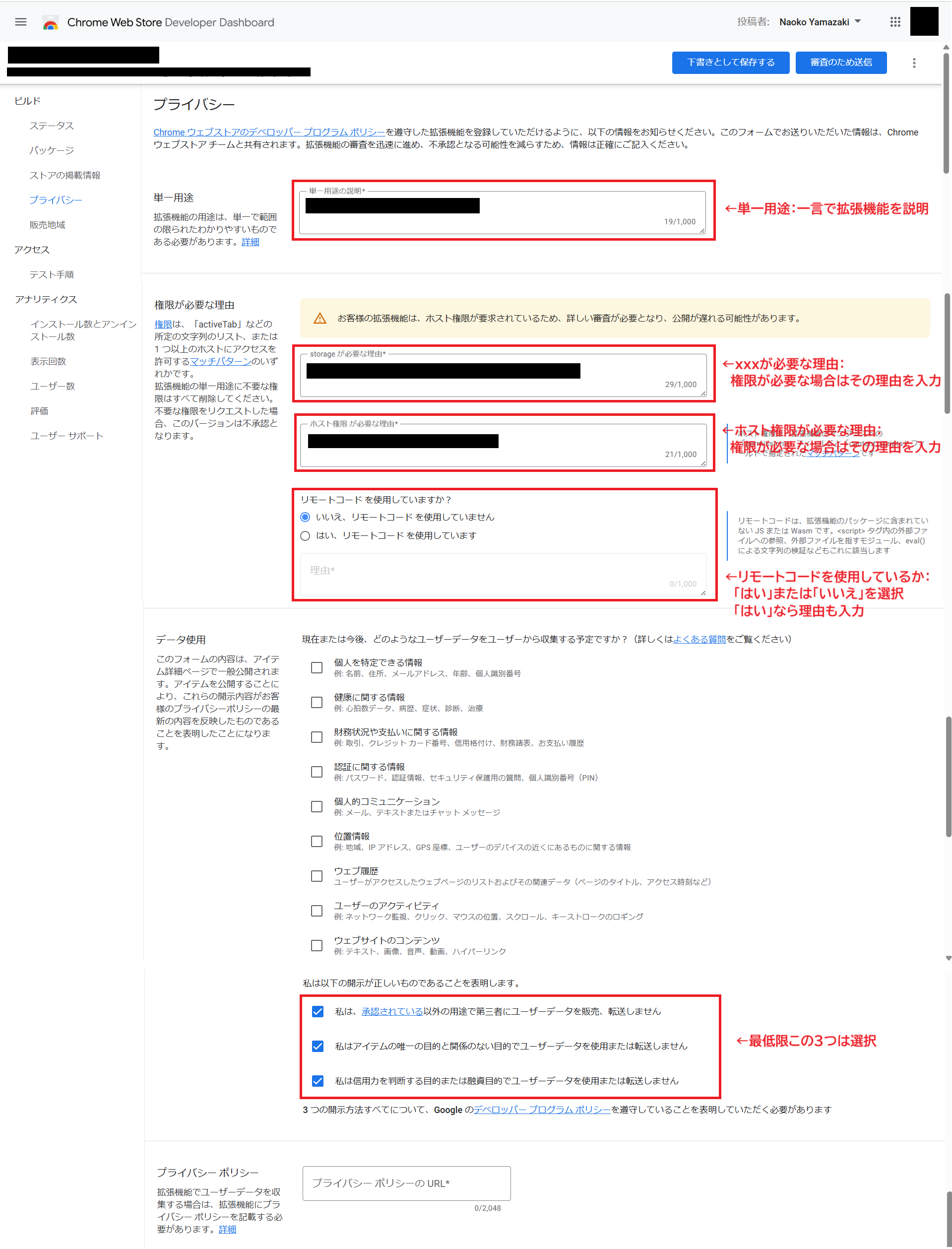 - xxxが必要な理由 →activeTab、scripting、storageなどの権限が必要な場合、その理由を入力する
