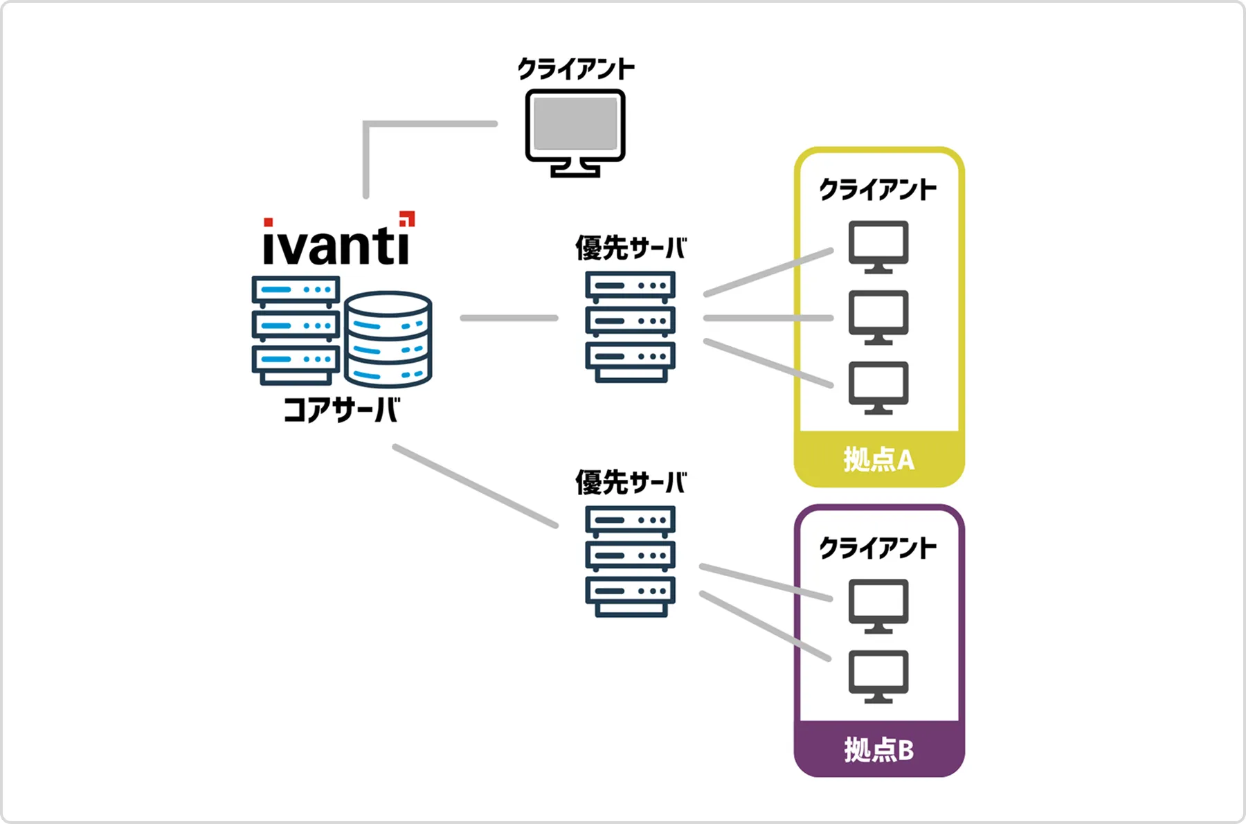 - 拠点毎に優先サーバを設けることでコアサーバへのアクセスを緩和すると同時にネットワーク負荷を軽減