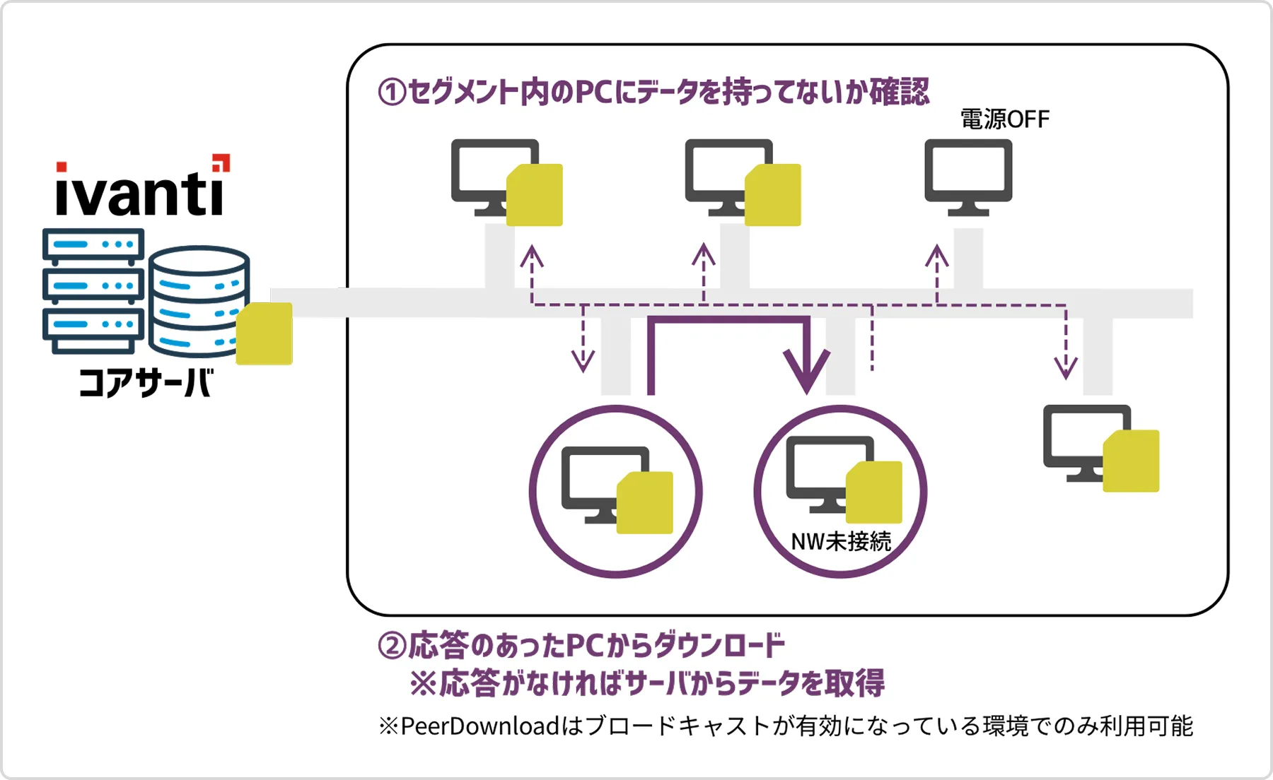 - マルチキャスト配信やピアダウンロード機能でネットワークの負荷を分散