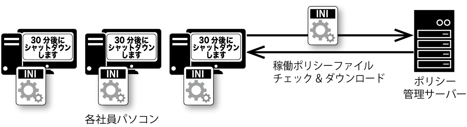 各PCの稼働時間ポリシーファイルを管理・配信することで、業務時間外のPC強制シャットダウンや警告メッセージを表示します。