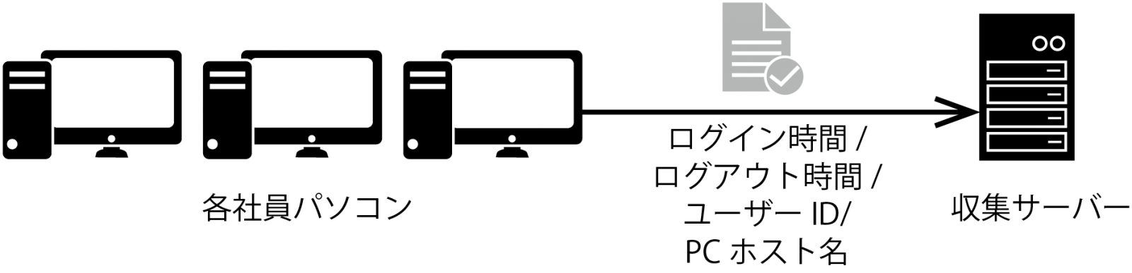 社員PCのWindowsログオン(サインイン)、ログオフ(サインアウト)、ユーザーID等の情報をリアルタイムに収集サーバーへ情報連携し各社員PCの稼働時間(労働時間)を一括集約できます。