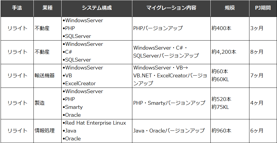 また、メインフレームからのリライトマイグレーションだけではなく、脆弱性が指摘されているフレームワークなどのリライトやブラウザ変更などの対応に伴う、プログラム言語の書き換え(リライト)にも対応しています。