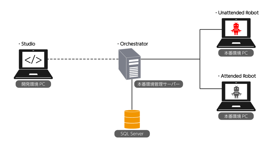 小規模構成では「Studio」「Attended Robot」、大規模構成(ロボット10台以上を集中管理する場合)では、「Studio」「UnAttended Robot」「Orchestrator」を中心に導入するのがスタンダードです。