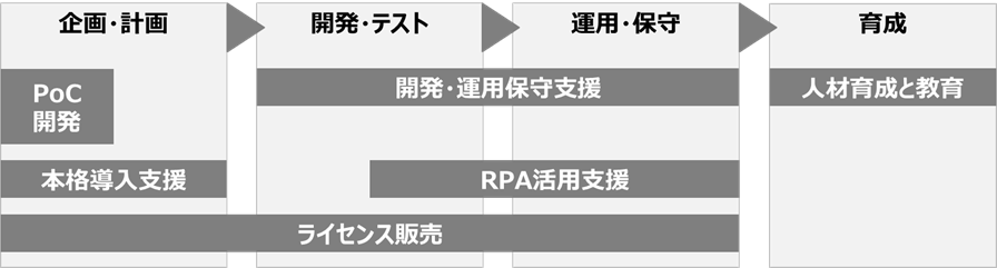 概要 | RPA導入フェーズに合わせた、開発・運用保守を支援するサービスです。開発フェーズではRPA化対象業務のヒアリングを基に設計書作成や開発、テストを実施します。運用保守フェーズではプロセス監視やインシデント対応、問合せ対応、課題管理を実施します。 |