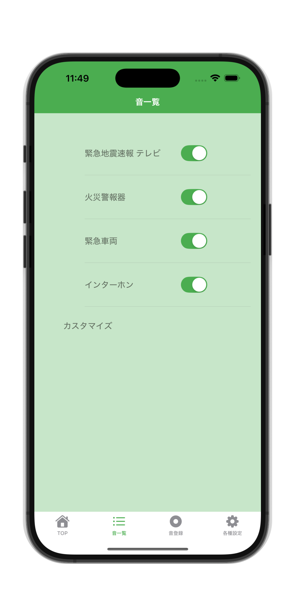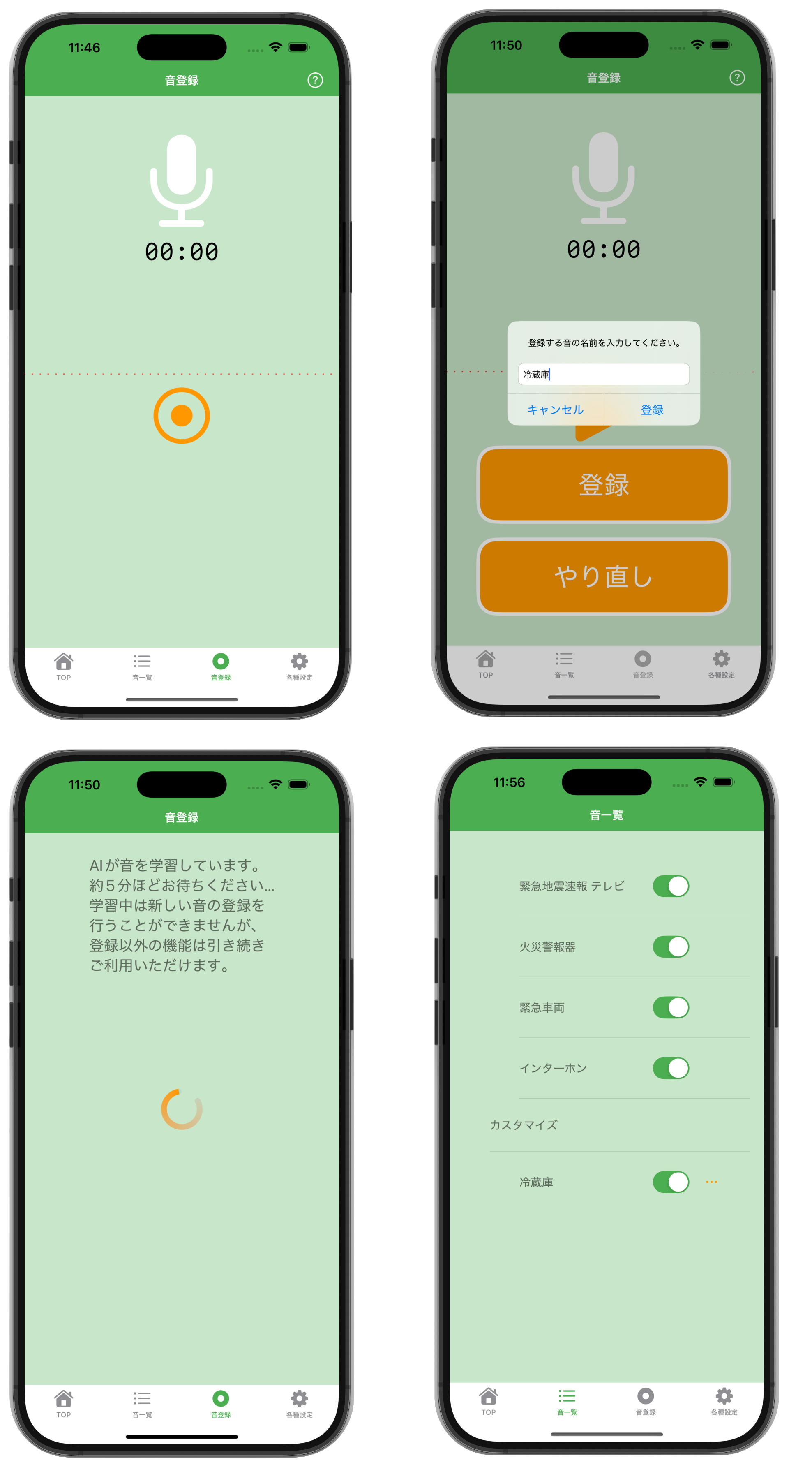 プリセット音以外で認識してほしい音をアプリ内から録音・登録できる機能です。アプリ内以外に、録音アプリなどで録音した音をSound Displayに連携して、音登録をすることもできます。