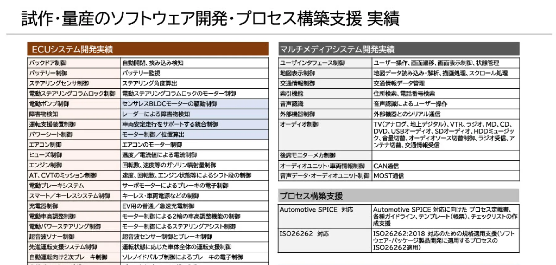 試作・量産のソフトウェア開発・プロセス構築支援 実績