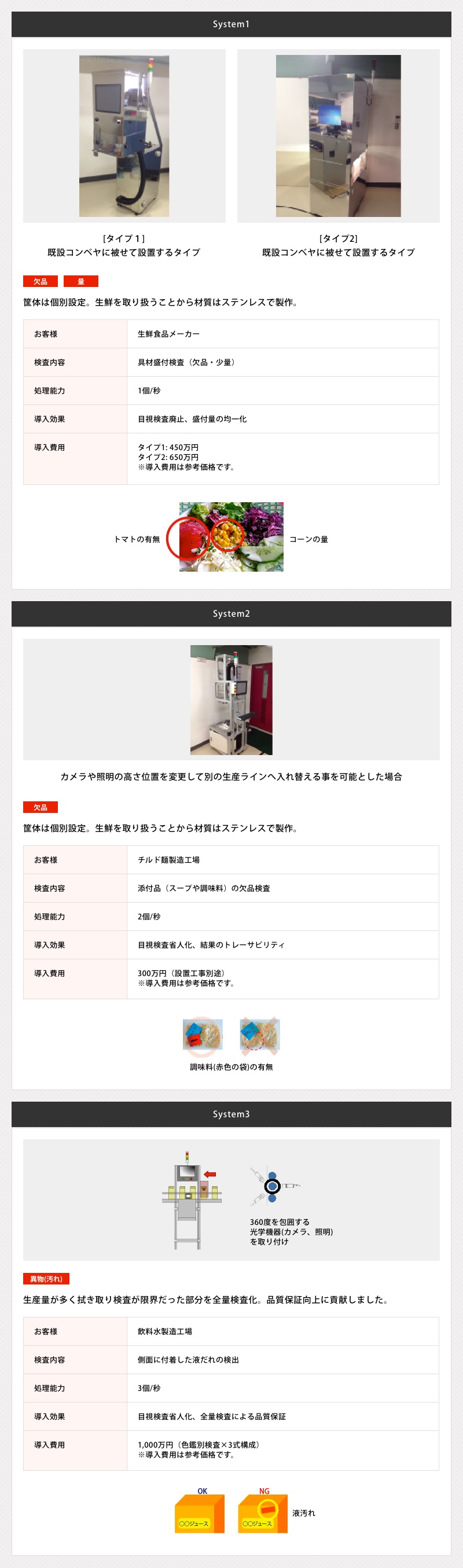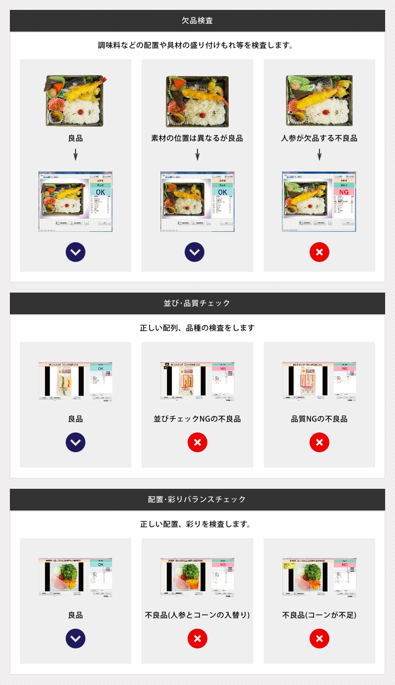調味料などの配置や具材の盛り付け漏れなどを検査します。