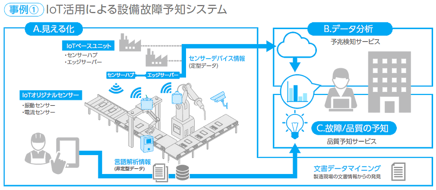 工場設備に設置した各種オリジナルセンサーから収集した定型データ、および報告書など非定型データを収集・分析し、機器の故障や製品の品質の余地を行うソリューションサービスです。