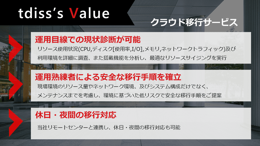 オンプレミス環境からクラウド環境への移行、プライベートクラウドからパブリッククラウドへの移行などで「OSのバージョンを変更せずに移行したい」、「OSバージョンも変更したいが変更点調査に時間が掛かり進まない」、と言った状況を移行診断・移行設計・移行作業までのトータルでサービスをご提供いたします。