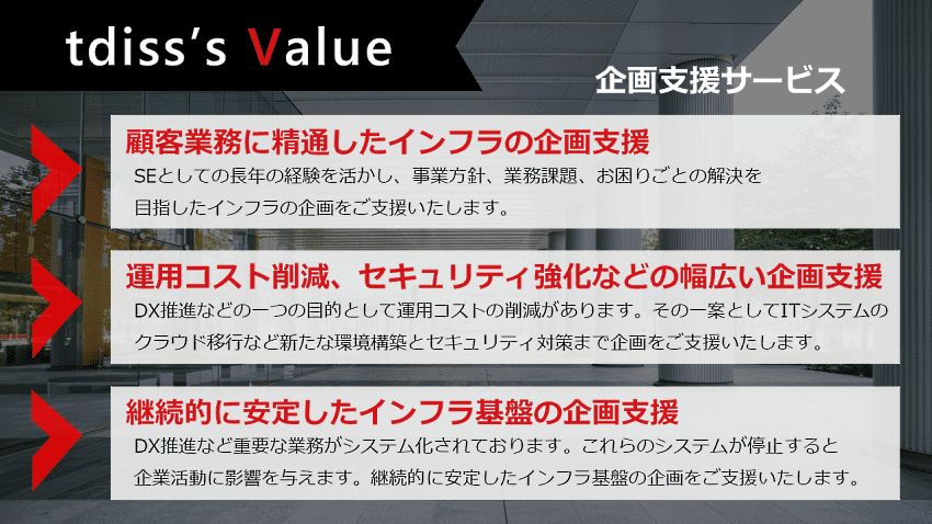 ITインフラ基盤全体を継続的安定性、コスト削減の観点などから総合的に判断し、最適な企画をご支援いたします。