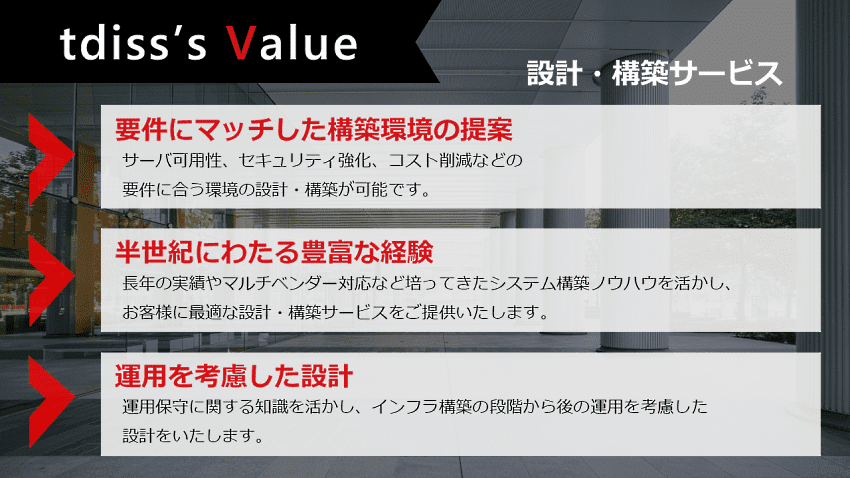 サーバ単体だけでなく、ネットワーク領域、セキュリティ領域、運用までシステム全体の設計・構築サービスをご提供いたします。